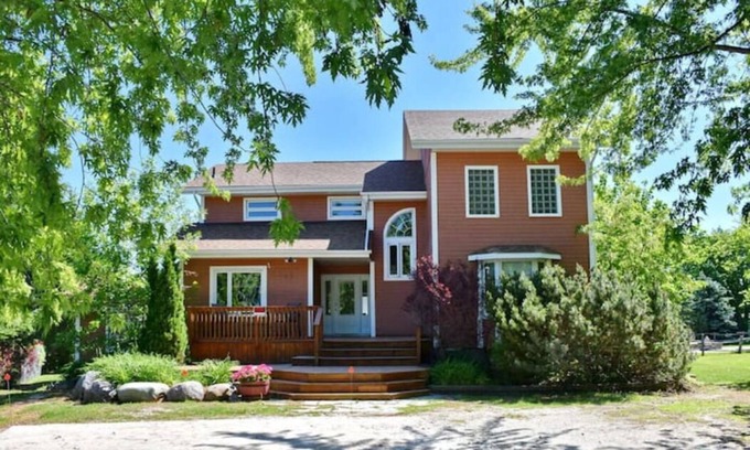 This stunning chalet is perfect for those looking to enjoy the great outdoors while still having all the comforts of home. It is located just a short walk from the Blue Mountain Village and offers easy skiing, hiking, and cycling access. With six bedrooms spread across three levels, there's plenty of room for up to 14 adults to stay comfortably. The chalet also boasts three bathrooms, a large great room, a recreation room, and an enormous eat-in kitchen. As you enter, you'll be greeted by a grand fireplace and a great welcoming hall with a vaulted cathedral ceiling. The dining area can comfortably seat up to 14 guests, and the massive deck with a BBQ and hot tub is perfect for relaxing after exploring. During summer, guests can even enjoy access to the Heritage Corners outdoor swimming pool. This chalet has it all and is the perfect place to unwind and recharge.