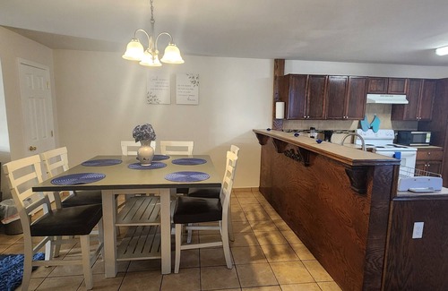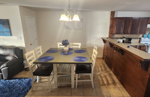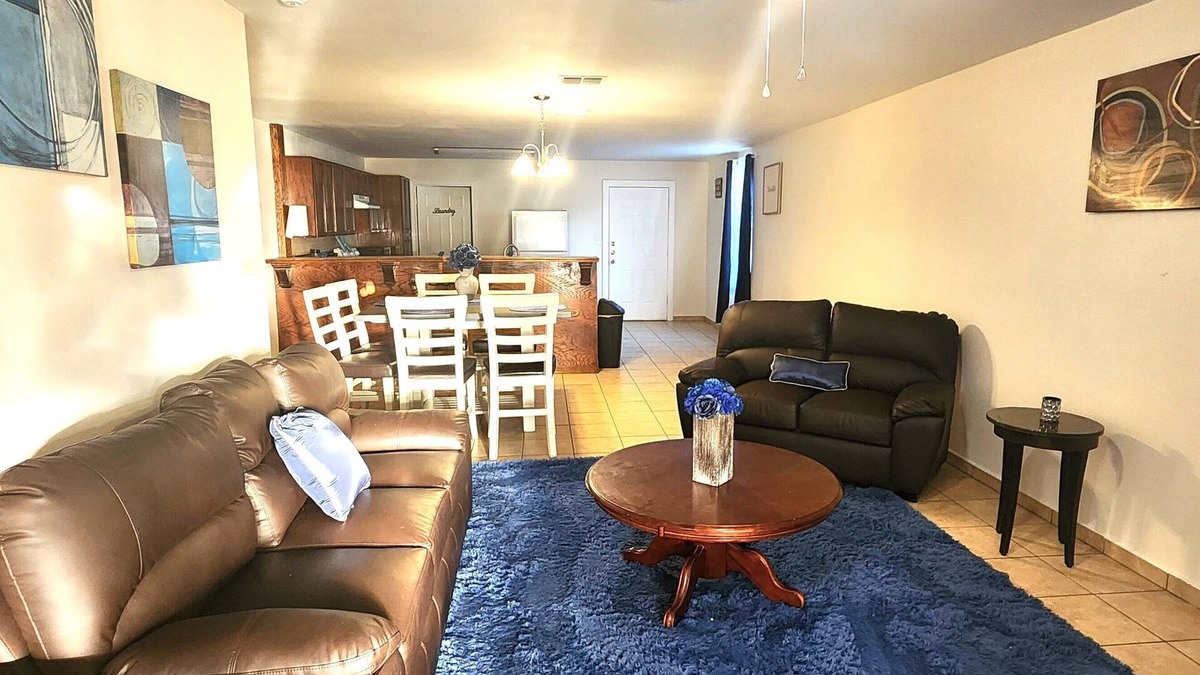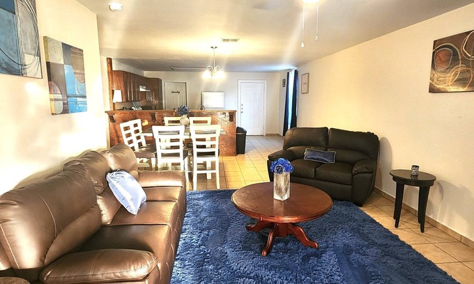 Experience tranquility in Eldinburg's heart. Our stylish duplex offers modern comfort with spacious living, a large kitchen, and peaceful bedrooms. Enjoy a private patio and balcony, smart TVs, and a fenced backyard. Centrally located, just 7 minutes from RGV University, with easy access to attractions and dining. Perfect for both business and leisure, Blue Oasis is your ideal home base. Book today and explore the best of Eldinburg! Your Stay at Blue Oasis: Central Escape Expect a harmonious blend of comfort and convenience. Our duplex is designed for relaxation, featuring spacious living areas and a welcoming atmosphere. Enjoy modern amenities like smart TVs and a private balcony. With a fenced backyard, it's perfect for unwinding. Centrally located, just minutes from RGV University, you'll have easy access to local attractions and dining options. Your tranquil urban escape awaits!.Room and Furniture Details: Our property offers spacious rooms designed for comfort. While furniture colors may vary, the sizes remain consistent. Expect comfortable bed sizes and ample seating with chairs that complement each space. Your comfort is our priority, ensuring a welcoming stay.