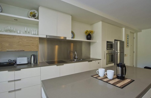 This apartment has quality furnishings throughout including flat screen TV's, leather lounges, relaxing cane tub chairs plus indoor and outdoor dining settings. It is self contained with a well equipped kitchen and laundry facilities.