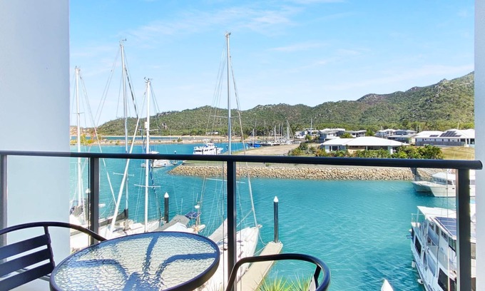 The studio has an ensuite, lounge area with TV and a private marina front balcony with outdoor setting.
