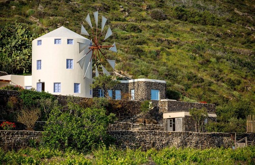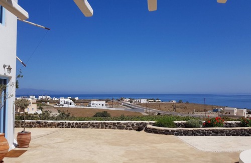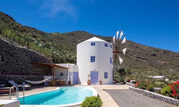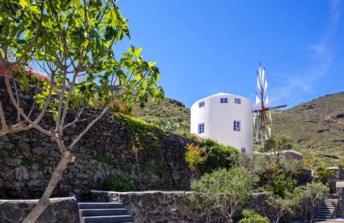 In one of the most beautiful coastlines of the world, nestled amongst vineyards and the endless blue skies of Santorini are located three private Windmill Villas. A perfect co-existence of minimal design without compromising luxury and modern comforts, charming simplicity and a picturesque setting. Space and light sparkle through the rooms, and if you open the windows, on a clear day you can see right across the Aegean Sea to the islands of Ios, Naxos, Amorgos & Anafi. The kidney-shaped swimming pool with Jacuzzi Jet streams, the Pergola with an amply shaded breakfast and meal area, and the home grown kitchen garden promises Mediterranean life style at its' best .