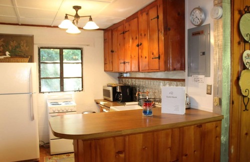 This is a darling doll house of a home with it's own boat dock! Two bedrooms, one has a queen size bed the other a full size bed and a shared bathroom. There is room for one more on the couch. The kitchen has new appliances but stays true to the vintage feel of this 1950's cottage. There is cell service in this home as well as WiFi. If that is important to you, please bring your own mobile hot spot. Come enjoy this charming cottage and get reacquainted with nature! Please no pets. Thank-you!