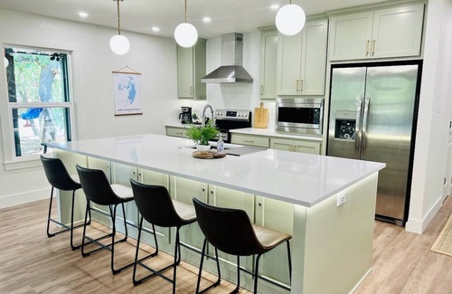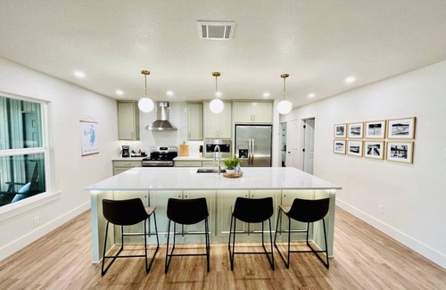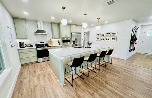 The dining area accommodates up to 6 guests, with an additional 4 barstools at the island, allowing for comfortable dining for 8. The highlight of this home is the expansive kitchen, featuring a huge island for meal prep, cooking, and dining. It comes fully equipped with pots, pans, dish-ware, silverware, cups, and more. Appliances include a dishwasher, oven, microwave, fridge with filtered water, and a large farmhouse sink.