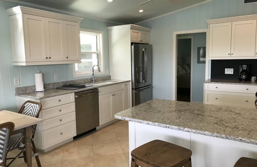 Completely renovated in November 2017, this stylishly furnished and exceptionally well equipped home is now available for weekly, monthly or seasonal rentals. Three night minimum off season rental also considered. One well behaved dog is permitted. No other animals. The beautifully furnished living room offers a brand new, 55 inch Sony Bravia flat screen television. The boat house’s private dock on the Bayou can accommodate your 22 foot boat.