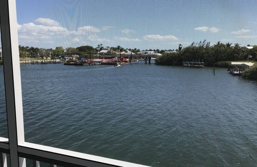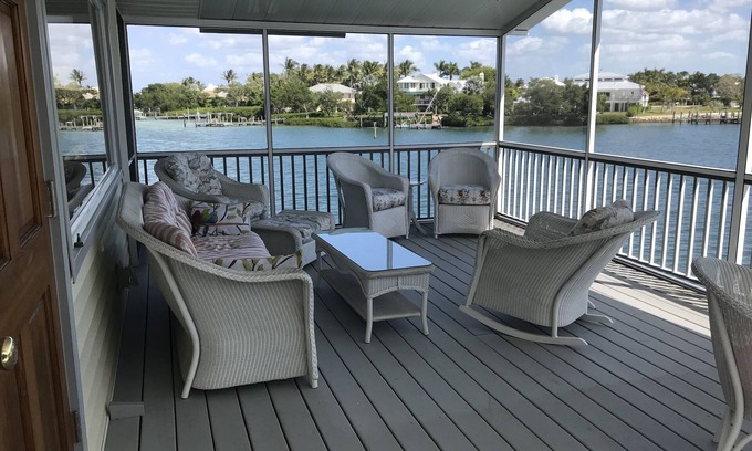 Watch the boats pass quietly by at idle speed from your porch directly overlooking the Boca Grande Bayou if you rent this 2 bedroom, 3 full bathroom elevated boat house. Main living area is accessible only by 24 step staircase.
