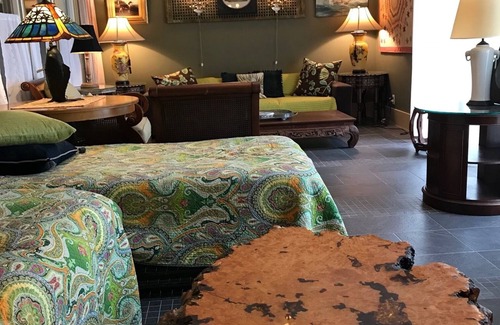The Grand LIVING ROOM is 26 feet in length, and has multiple sitting areas and sofas (two additional guests can be accommodated on the two tatami-and-futon sleep areas). The Living room has an impressive double set of floor-to-ceiling French doors that open onto the large and spacious brick-floored GARDEN TERRACE facing the South gardens. There is outdoor seating and amazing views onto the uniquely planted and designed gardens which contain soothing fountains, art installations and which faces the Gulf of Mexico beyond.