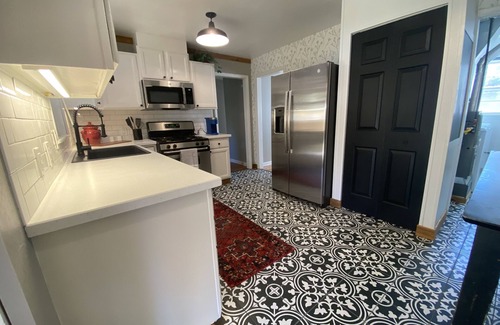 - Kitchen: New quartz countertops, large basin sink, dishwasher, gas range, large refrigerator, pantry, dining table and tiled floor. Kitchen has everything needed for cooking and dining.