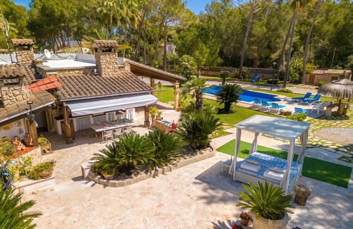 Welcome to Bon Pas, a charming holiday villa located just 250 metres from Manresa beach, in Mal Pas, surrounded by picturesque pine trees and the serenity of the sea. This beautiful property is situated in a natural and tranquil environment, close to the old town of Alcudia, making it an ideal option for those seeking a relaxing and pleasant getaway.Bon Pas has been designed with special consideration for accessibility, being completely suitable for people with reduced mobility. The villa is distributed on a single floor and has wide doors to facilitate wheelchair access, as well as a fully equipped bathroom for people with disabilities.This cosy property can comfortably accommodate 6 adults and 2 children. The main house can accommodate 4 people, while the independent annex, located 20 metres away, offers space for 2 adults and 2 children. The main house includes two double bedrooms and a bathroom, while the annex consists of two connected rooms and a fully equipped bathroom adapted for people with disabilities, making it a perfect option for families with children.Each room in the villa is equipped with air conditioning and heating to ensure a comfortable stay throughout the year. Additionally, the villa offers an independent, fully equipped kitchen with an electric oven and ceramic hob, giving guests the freedom to prepare their own meals if they wish.The place is a true paradise to enjoy the summer, thanks to its spacious private swimming pool surrounded by lush gardens. Additionally, it features an outdoor shower with cold and hot water, sun loungers for sunbathing, and a Balinese bed to immerse oneself in the tranquillity of the island.The property also offers numerous entertainment areas for both adults and children, with a basketball hoop, ping-pong table, two slides, two mini football goals, a badminton and volleyball court, a golf training area with 7 holes, swings, hammocks, a wooden treehouse for children, and bicycles for adults and children.The porch surrounds the villa and offers various spaces to enjoy the outdoors, including a spacious table for outdoor meals in good company, an area with comfortable armchairs, a barrel table with stools, and another outdoor dining area next to an outdoor kitchen with a grill, ideal for preparing delicious roasted meals. The barbecue area is fully equipped and firewood is provided free of charge. Additionally, the property has private parking and the plot is fully fenced, ensuring the safety and privacy of guests.IMPORTANT:- All additional payments and online registration procedures are managed through instant messaging, outside the platform.- All guests over 16 years old staying in holiday homes must pay the tourist tax. Some portals do not charge it, in this case they will receive a separate message to make this payment.- Important note about electricity consumption:Out of respect for the environment and with the aim of promoting responsible use of resources, the cost of electricity is not included in the accommodation price. A charge of 0.30 Eur/kwh will be applied for electricity consumption, to be paid at the end of the stay.- A refundable deposit is charged.- Parties are not allowed.- To comply with the law, an identity document is required from all guests before entering the house.- Please note that the gardener accesses the outdoor area one or more times a week for garden and pool maintenance.- In Mallorca, especially in rural areas or near nature, the presence of insects such as mosquitoes, ants or wasps is common. This is a natural and common phenomenon on the island.Additional service included in the price: extra cleaning every 7 days during the client's stay. A review will be carried out in the living room, kitchen, bedrooms and bathrooms. Clean sheets and towels will also be provided.