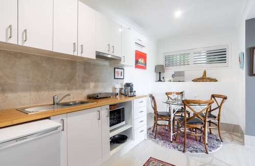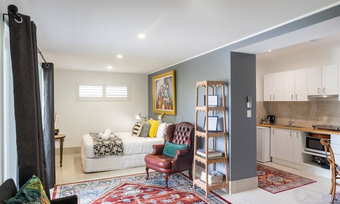 This guesthouse sanctuary is perfect for long-term guests or weekend getaways to explore the quirky cafe culture of Paddington. A large plush queen bed and airy space make this studio the ultimate destination to relax and unwind. With a large bathroom perfect for washing away the day's adventures, a private balcony to enjoy an evening wine (or two) and the cared-for gardens, you'll feel like you’re on your own tropical getaway in the middle of suburbia.