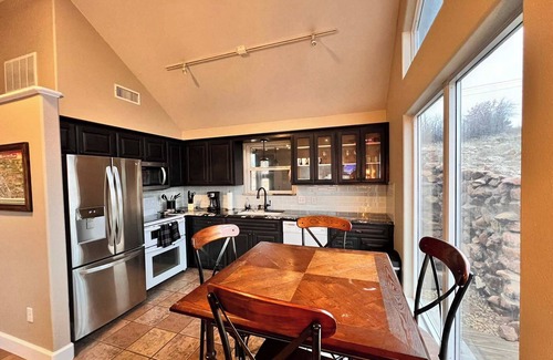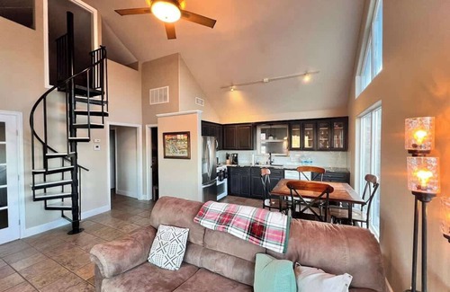 Enjoy luxury lodging in Medicine Park with creek and mountain views, walkable to dining, shopping, and Bath Lake. Sleeps 10 with 1 king, 1 queen, 1 full, 3 twin pullouts, and a sofa bed. Features 2 full bedrooms, loft, 2 baths, leather furniture, full kitchen, and new appliances. Across from Riverside Café and Parkside Tavern. Great for family vacations, romantic escapes, and wildlife adventures. Price based on # of guests, pets, time of year.