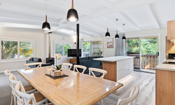 Welcome to Boomerang at South Durras, a beautifully renovated getaway that combines modern comfort with natural beauty. Perfect for families or groups, this spacious property boasts an open-plan living, kitchen, and dining area that flows seamlessly onto a deck with tranquil leafy surrounds. Gather around the cozy slow-combustion fireplace in winter or stay cool with reverse-cycle air conditioning in summer. With high-speed WiFi, a grassy backyard, and ample parking (including space for your boat), you’ll have everything you need for a relaxing stay.