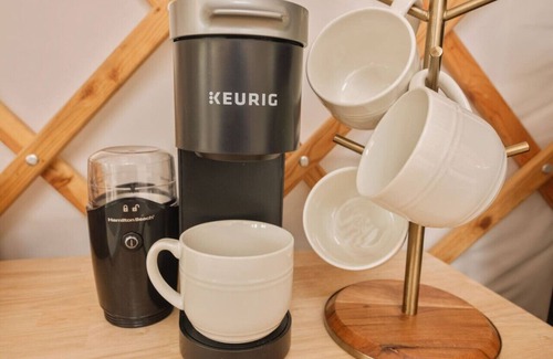 The yurt is dry, meaning there is no running water. You`ll have a water container that can be filled from the well outside, and a grey water bucket below. The kitchenette is fully equipped with a small sink, microwave, fridge/freezer, Keurig coffee maker, French press, coffee grinder, electric cooktop, toaster, cooking spices, and all necessary dishes and utensils. Enjoy locally roasted coffee from Farm Loop Coffee, tea from Felicity Loft, and lotion made by Grey Fox.