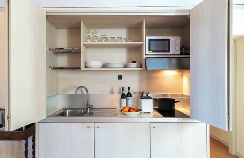 The guest will be available: microwave, induction stove, set of pots, plates and cutlery, Nespresso coffee machine, Nespresso coffee machine, tea kettle, toaster, juicer and a full range of cups and cooking utensils.