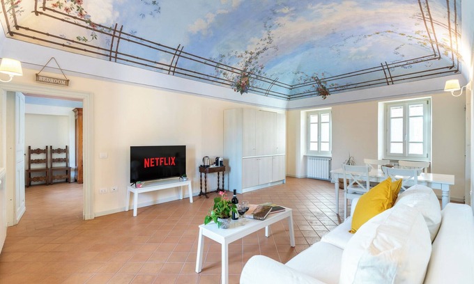 When you look up, you'll immediately capture the beauty of the frescoed ceilings, details of an era that blends harmoniously with the most modern amenities, such as a 52”Smart TV with Netflix, Prime videos, Youtube, …, ultra-fast Wi-Fi, and brand new appliances.