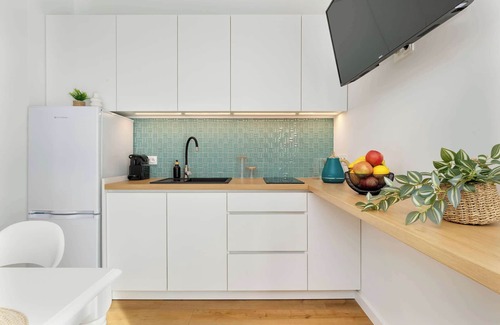 Induction hob, fridge with freezer, electric kettle, dishwasher, set of dishes, kitchen utensils, table with chairs