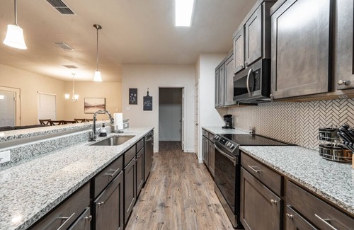 Come to Lubbock and enjoy this brand new 3-bedroom 2 bath home in a new and safe neighborhood in south Lubbock. This location is perfect for small and large groups alike. This house features three new bed sets, high quality couches, a 65-inch TV with Netflix access, fast Wi-Fi, a fully stocked kitchen for all your cooking needs, and the best new mattresses for great rest!