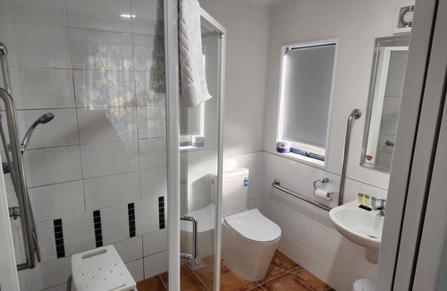 GeneralNumber of living rooms 0, Number of bedrooms - 0, Ping - 5, Square meters - 18, Hand-held showerhead, Number of bathrooms - 1, Portable shower seat, Lowered electrical outlets in bathroom, Kitchen, No rollaway/extra beds, Square feet - 194, No cribs (infant beds), Wheelchair-accessible bathroom vanity, Bed count minimum 1, Bed count maximum 1 |