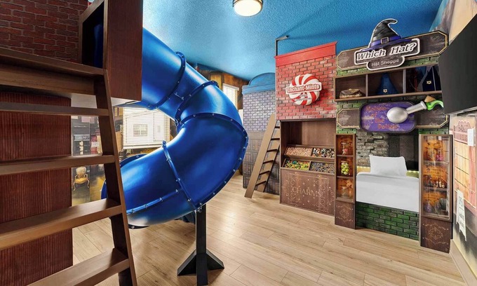 (4 twins; 2 fulls) Prepare to be spellbound when you step (or apparate) into this truly unique ‘Wizarding Wonderland’ Themed Bedroom, featuring SIX plush beds (4 twins, 2 fulls across 3 bunk beds) and absolutely magical decor. A full-blown wizards’ market comes to life all around you–from the sorting hat shoppe, to the ‘liebrary,’ to the storefronts showcasing charms, potions, and wands. Part playroom, part bedroom, this fantastical space is sure to cast a spell on your little ones’ vacays.