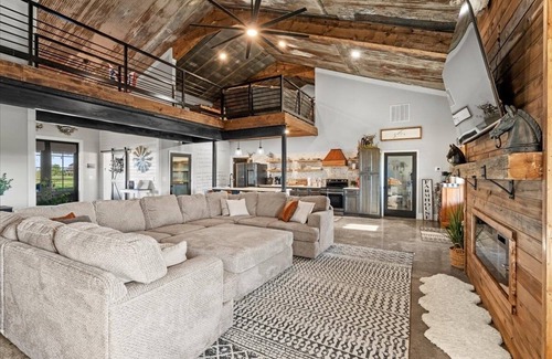 Big Sky Barnhouse (KY)...Where historic meets extraordinary. Sleeps 20 guests, 6 bedrooms, 12 beds, 2 Barns, 7,000 sq ft, on a sprawling country estate with amenities galore. Golf simulator, movie theater, hot tub, custom sports bar, 30ft Bourbon Trail Mural Map! Bourbon barrel high top entertainment space, pool table, game room/arcade, hexagon pergola fire pit, and so much more. Located close to Lexington and all of the Bourbon Trail w/ incredible panoramic views of beautiful Bluegrass Country!