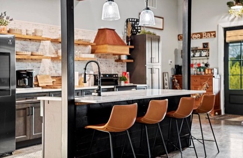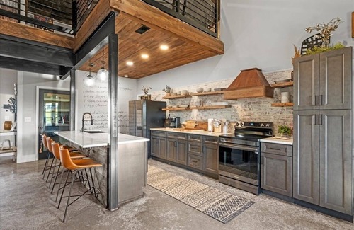 ★ The barndominium was mindfully crafted with the most unique touches - 3 custom cupolas with dusk to dawn solar lighting, stairway, catwalk and beams repurposed and restored from a bridge from a nearby town, rustic tin ceiling panels throughout, and life sized wallpaper decor with century old family recipes.