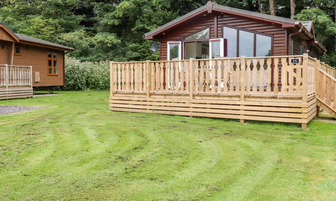 Amenities: Gas central heating. Gas oven and hob, microwave, fridge, freezer, dishwasher. TV, Free WiFi. Fuel and power inc. in rent. Bed linen and towels inc. in rent. Off-road parking for 2 cars. Large decking surrounding the lodge and furniture. Two well-behaved dogs welcome. Sorry, no smoking. Shop 1.5 miles, pub 2.4 miles. Note: There is course fishing available on-site and a permit can be purchased online