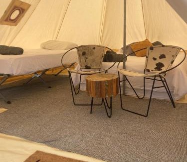 Towels and bed linen are featured in the luxury tent. The property has an outdoor dining area.