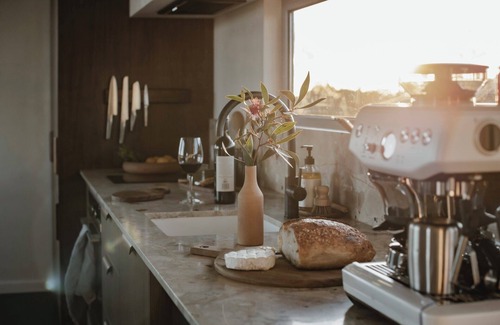 Designed for two or a peaceful solo escape, this cozy adults only getaway features a king bed with Carlotta & Gee linens, a north-facing window seat for winter reading, a compact laundry, separate toilet, and a stunning bathroom with rain shower and stone bathtub—perfect for a long soak in pure rainwater. Cook up a delicious meal in our fully equipped kitchen and step outside to the fire-pit and admire the hand built Spongolite rock fireplace.