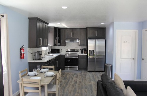 The well-appointed kitchen features sleek stainless-steel appliances and comes fully equipped with all the cooking utensils you'll need during your stay. You'll also have the convenience of an in-unit washer and dryer, making laundry a breeze.