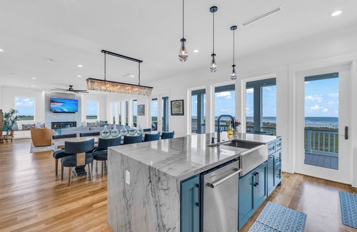· The oceanfront kitchen is equipped with high-end appliances including a 6-burner gas range, double ovens, a wine and beverage center, an ice machine, and a coffee bar. The whole gang can gather around the oceanfront dining table for 10, with adjacent seating for 4 more at the kitchen island.