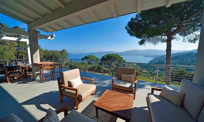 Brand new independent villa overlooking the gulf, with enclosed private garden and surrounded by a 20,000 sq m wood. Two bedrooms + a French sofa bed in the living room (max 5 + 1 guests). Large terrace with sitting area and outdoor table for dining overlooking the sea. Two bathrooms with shower, air conditioning, barbecue, sink and outdoor shower, washing machine with dryer and free wi-fi. Kitchen equipped with all types of appliances. Guaranteed maximum tranquility and relaxation. Guests have access to all the spaces of the villa, its terrace and garden. The villa is single-family, therefore nobody will disturb the privacy of the guests!