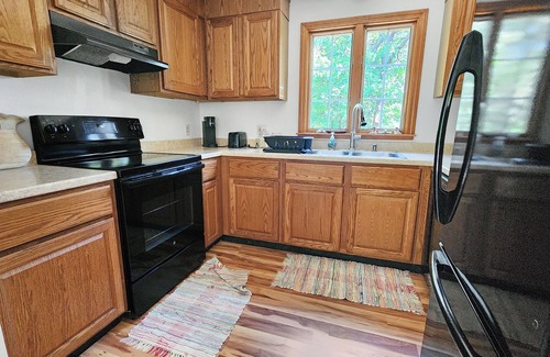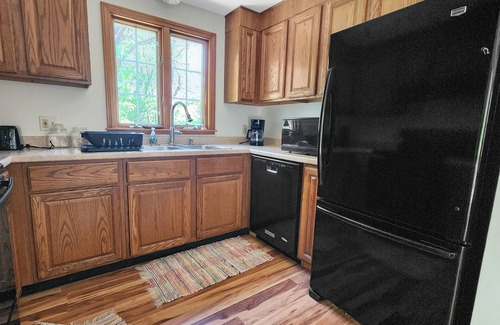 The dining room has a table with seating for six, a ceiling fan and a slider to the deck. The nicely equipped kitchen, just off the dining room has a solid surface range, refrigerator, dishwasher, microwave, Keurig and drip coffeemakers and toaster.