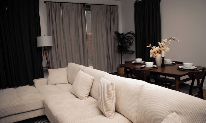 Relax and unwind after a day of exploring with the open concept living room that boasts of a brand new 70 inch smart TV, plush sofa, dimmable lights, light filtering blinds, and blackout curtains.