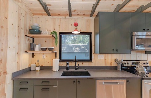 Within this welcoming 1,200-square-foot cabin, you'll discover an inviting interior that exudes the essence of 'hygge'. Elevated ceilings and large windows make the space feel airy and bright, and help bring to focus the intended Scandinavian design inspirations: clean, simple lines, minimalism, and functionality without the sacrifice of beauty.