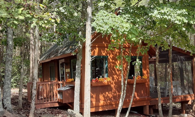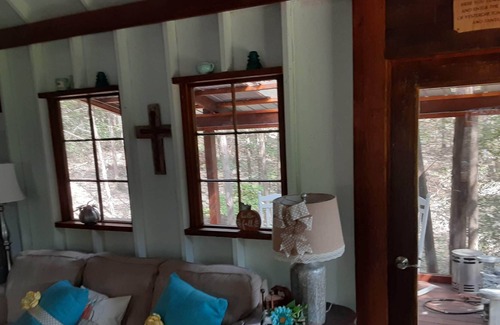 Our cottage has a retro feel , filled with nostalgia, games, and records. It is nestled in the trees, on the side of our log cabin, by a wet weather creek and close to our sweet goats. It has a sleeper sofa with a queen bed and a loft with a queen bed as well. There is a nice family room, small kitchenette with sink/microwave/refrigerator/ Keurig coffee maker /toaster, breakfast bar and stools, large bathroom with shower, and extra large screened in deck with a hot tub.