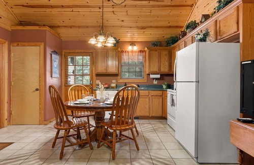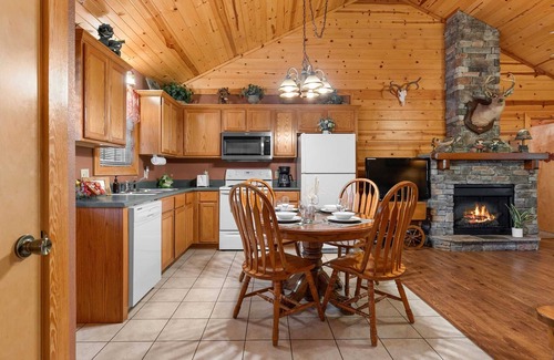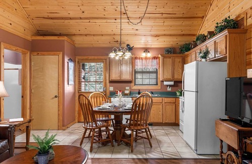 We give you everything you need to make your favorite meal in this kitchen. Muffin pans, plenty of plates and utensils, a crock pot, cookie sheets - we have it all! What could be better than enjoying a family-favorite at your log cabin in the middle of the Ozarks on your vacation? Of course, there are plenty of wonderful restaurants nearby, but you'll want to eat in at least once. The kitchen is also open to the living area, so the chef gets to stay in on the conversation. There is also a dining table that can also double as the family game night headquarters!