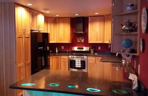 The house has a built-in sound system with Bluetooth and Sonos. LED lit agate countertop. The Master suite includes a California King and an air jetted tub. Two of the 3 bathrooms have double sinks to help get families outbthe door together! Our property has a large, manicured lawn surrounded by woods, so you feel like you have lots of privacy, yet it is only a short 5-minute drive from downtown Palmer and many attractions nearby. Our hammock, patio, firepit, and playset will make a family want to just hangout around the house all day long. The house also has an incredible surround sound system throughout the main living area of the house and a separate sound system for the master suite. The lighting is also quite versatile, with dimmer switches, undermount lighting in kitchen, motion sensor lights in walkways, and blackout blinds and curtains in bedrooms.