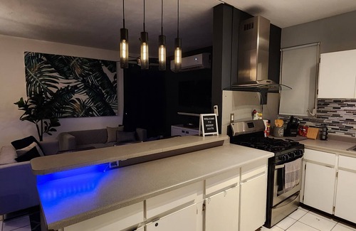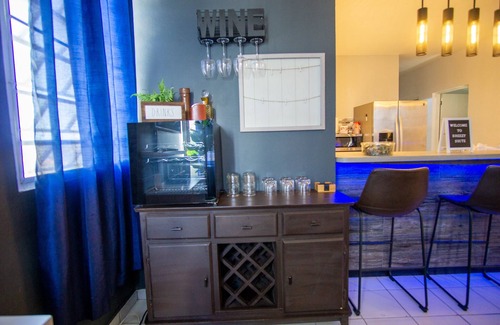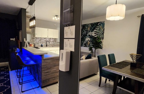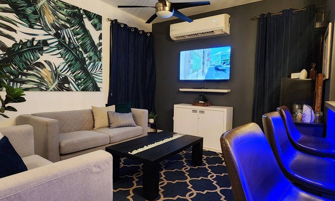 This spacious apartment features two beautiful and well-equipped bedrooms, each with independent quiet AC units, large closets, and mirrors. The open concept living, dining, and kitchen areas are perfect for relaxation and socializing. The living room boasts a 55" Smart TV with ROKU/APPS and CableTV, as well as a huge sectional for ultimate comfort. Our clean wine bar, complete with wine glasses and a wine chiller "see-through" fridge, provides a perfect setting for enjoying a glass of wine.