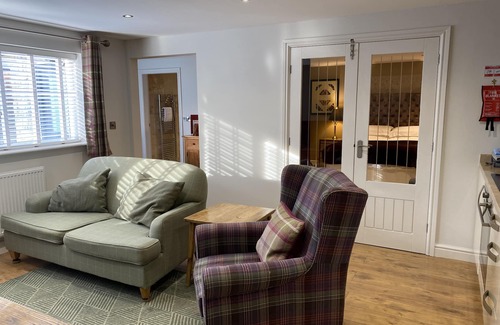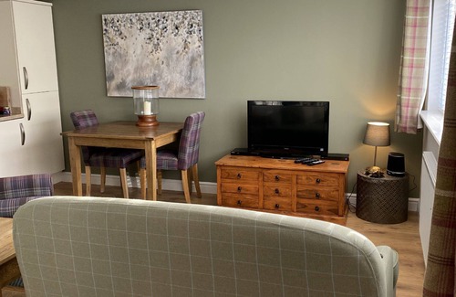 Arrive through the entrance hall that leads into the lovely open plan kitchen and living area. Open the blinds to let the natural light flow in through the windows spanning the wall of the living area. Flick on the TV to watch your favourite channel and cuddle up on the winged chair and sofa for a well earned rest. Connect to the free WiFi to stay connected with work or stream a film on your laptop or smart TV.