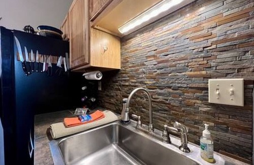 As you step inside, you'll immediately notice the unique character and inviting ambiance of the space. The living area features exposed brick walls that exude warmth and lend a touch of history to the home. Sink into the cozy sofa, or snuggle up in the oversized bean bag, and unwind after a day of travel and/or exploration. Watach your favorite TV show or enjoy a good book by the large windows, allowing natural light to fill the room.
