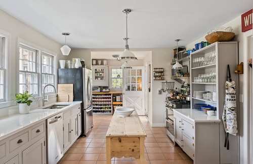 There is a large, bright blue and white first floor king master, bath with clawfoot tub and large walk -in shower, the country french dining room seats 10, there's a breakfast nook and loads of linens and serving pieces for entertaining. Stainless Steel appliances with a gas stove, dishwasher and everything you can imagine including All-clad cookware. Upstairs 4 bedrooms 2 baths, all charmingly decorated with nautical and shabby chic design. Nice linens, down pillows, down blankets and comforters. Ceiling fans throughout and central air.