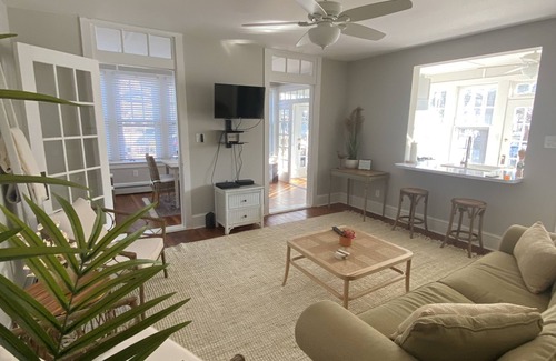 Relax in this historic Cape May retreat on iconic tree-lined Washinton St. on a large sunlit enclosed porch with wall-to-wall windows watching vacationers and locals stroll by. Enjoy a meal with friends at the dining table or a cup of coffee at the breakfast bar looking out through the equally sunlit kitchen windows. Walls of windows brighten the large family room with nautical decor and comfy sofa with a pull-out queen bed. The retreat comes ready with sheets and Turkish towels. Two full baths, recently renovated, have large walk-in showers. The primary bedroom has an en-suite bathroom for convenience and privacy. Located just 3 blocks from the Washington Inn and other signature Cape May eats! Washington Street Mall is located just 5 short blocks away where you can shop, dine, or enjoy a cocktail in the Brown Room at Congress Hall. Looking for adventure, grab a house bike and a beach towel and head to Madison Ave Beach, less than one mile away! Sit and relax the day away or head to Grant Street beach or the Cove to catch some waves! Had enough of the beach? Grab your tennis racket and check out the Physick Estate, or call the Cape May Free ride to visit one of Cape May’s amazing winery’s. If you like to fish, you’re in the right spot with local charters or take a booze cruise on the Tiny Tiki out of South Jersey Marina! In Cape May, you can do nothing at all, but there will never be nothing to do!