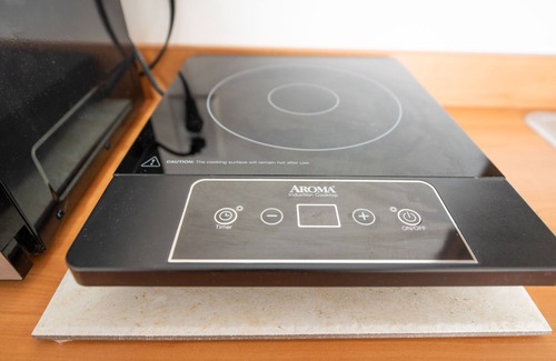 convection oven, induction cooktop, dishes, coffee cups, glasses,