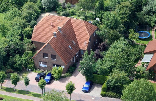 The apartment is on the upper floor of our Inselhus holiday home. There are six separate holiday apartments in the Frisian clinker building. The house has a garden where you can sit and lie, a table tennis table and various play equipment for children, such as. B. a trampoline is ready. Washer and dryer in the common room can be used at an additional cost.