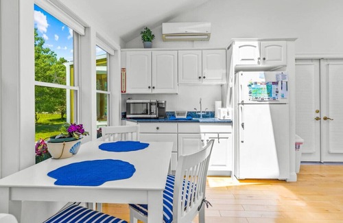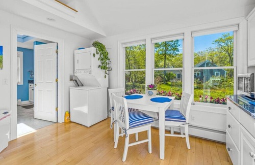 Peaceful and spacious guesthouse in Brewster - minutes from Wequassett Resort, beaches, golfing & more. This space is complete with cathedral ceilings, skylights, a shared large patio with outdoor seating, gas grill, parking, and a washer/dryer. Enjoy your morning coffee on the patio, Keurig & K-cups provided. Linens, shower essentials, towels, and beach accessories are all supplied. An ideal location & space for a couple's escape with activities, restaurants & shopping moments away!