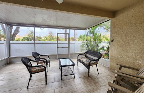The spacious setup can comfortably sleep 8 people, and includes 1 King Bed, 2 Queen Beds, and 1 Full Trundle Bed, with a cozy living room area, updated kitchen with gray soft-close cabinets and granite counters, an office nook, dining table with 6 chairs, and a large screened-in lanai with patio furniture for you and your guests to privately relax, hangout, and unwind!