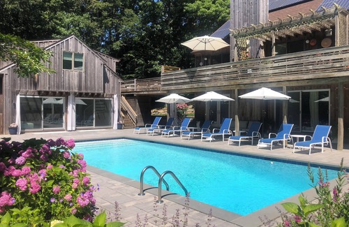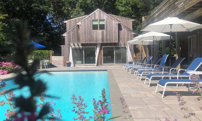 The unique landscape of this compound creates distinct areas for relaxation creating the effect of being nestled into the land. Amenities include solar heated gunite pool, side lawn, professionally landscaped property, Deck with hammock, 10-person outdoor dining table on patio, hanging chair, Outdoor shower, Office, Separately Zoned Central Air, High Speed WIFI, Hardwood floors, Weber Barbecue Grill. Closest beach is an 8 minute drive and the Village is about the same. Closer convenience grocery stores are a few minutes away. Bay beach is 5 minutes away. Being surrounded by water on all sides is really what makes Southampton such a special place. The blueness of the sky and the sweet ocean air will calm your sense and the gorgeous farmland and perfectly manicured stately homes will delight your eyes. Video has not been updated