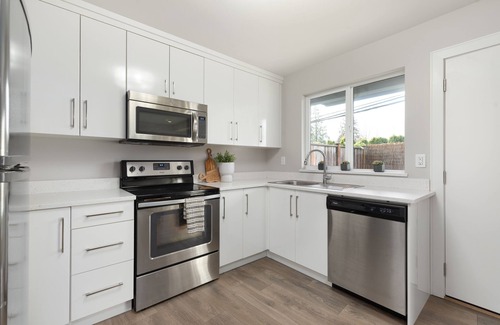 This suite is newly-built and includes a full oven, microwave, dishwasher, and a full-size fridge and freezer. The living room features a gas fireplace, and the unit has its own temperature control. The suite includes its own private outdoor space in a sunny, south-facing backyard. Our internet is fast and reliable, and our TV has Netflix and Prime.