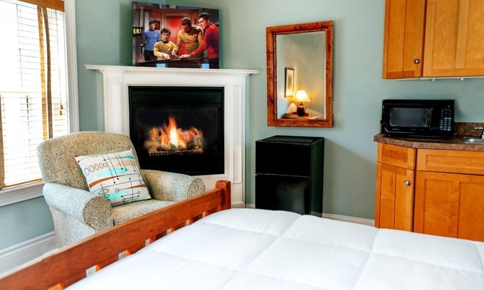 Relax in a queen-size bed, unwind by the gas fireplace, or sip a drink in the cozy sitting area. A skylight brings in soft natural light, and the convenient wet bar and coffee maker make mornings easy.