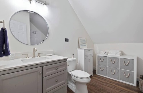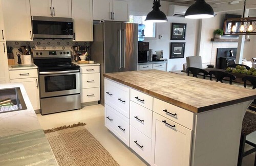 The Carriage House at Piper’s Cove sits up the (tiny) hill from the Main Waterfront Cottage. Newer construction, this 1400 sqft one queen sized bedroom apartment was added above the craftsman style garage, complete with a full straight-line kitchen, one full bath, its own W/D, queen pull-out sofa and additional twin trundle beds. There are doors to close off the living area with the sofa and trundle bed for privacy.