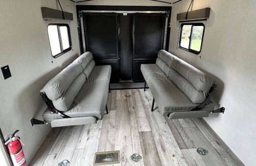 This camper has 3 beds, providing space for 6 adults. In the front you will find a queen size bed in a private room with dual bedside wardrobes as well as overhead shelves for extra storage. The kitchen features a deep sink, a three-burner range, overhead cabinets, and a refrigerator/freezer to keep things cold and fresh. Across from the kitchen find a slide out u-shaped dinette that folds down for sleeping space at night. When it's time to relax and watch TV inside, the entertainment center is conveniently facing the living/kitchen space along the interior center wall above the fireplace. In the middle of the camper, you will find a bathroom with a walk in shower. Through the bathroom you will find a 12' garage. The garage is also fitted with benches on either side that fold down to sleep 2 adults. These also fold up flat to utilize the garage space.